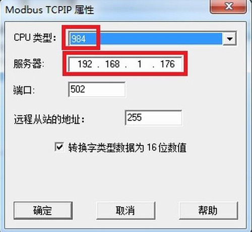 2.右擊“Modbus TCPIP/IP 單元#1”選擇“新驅(qū)動程序的連接”,新建一個名稱,點擊“屬性”,彈出屬性的對話框,在“CPU類型”選擇“984”,在“服務(wù)器”中填入BCNet-FX的IP地址,點擊確定。