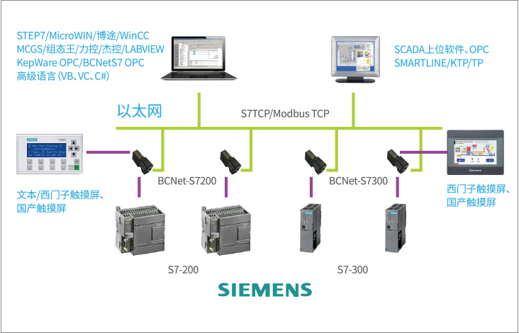 BCNet-S7300支持工控領域內(nèi)絕大多數(shù)SCADA軟件,支持西門子S7TCP以太網(wǎng)協(xié)議和ModbusTCP協(xié)議。