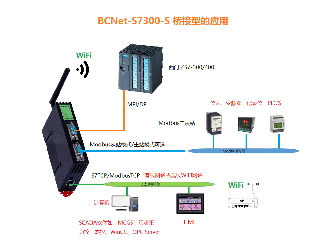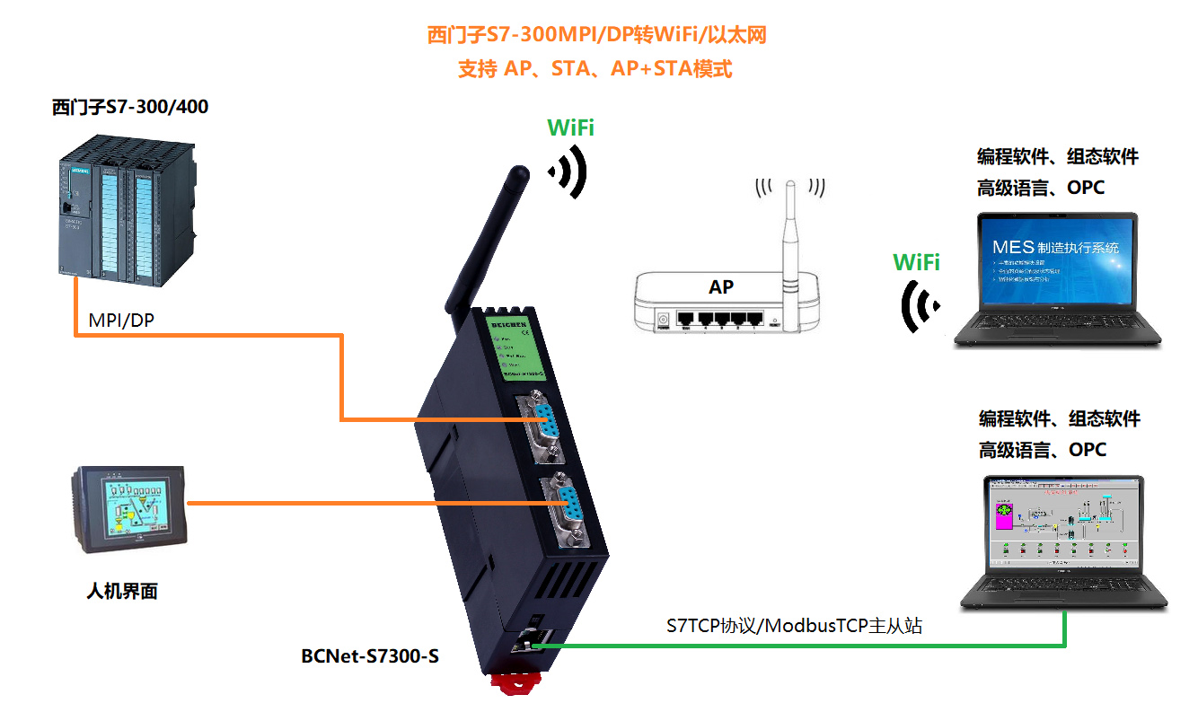 產(chǎn)品簡(jiǎn)介 BCNet-S7300-S用于西門子S7-300/400/西門子數(shù)控840D、840DSL等PLC的數(shù)據(jù)采集,非常方便構(gòu)建生產(chǎn)管理系統(tǒng)。模塊集成WiFi功能,支持AP模式、STA模式和AP+STA模式,帶膠棒和磁吸天線,方便構(gòu)建WiFi網(wǎng)絡(luò),直接通過WiFi進(jìn)行PLC編程、數(shù)據(jù)采集和數(shù)據(jù)交換。支持與 S7-200SMART 、S7-1200/1500、S7-200/300/400的以太網(wǎng)接口進(jìn)行通訊、ModbusTCP主從站通訊和點(diǎn)表探測(cè)功能。直通型和橋接型可撥碼選擇,直通型的九針母口,支持S7多主站通訊,橋接型的九針母口支持ModbusRTU主從站通訊。