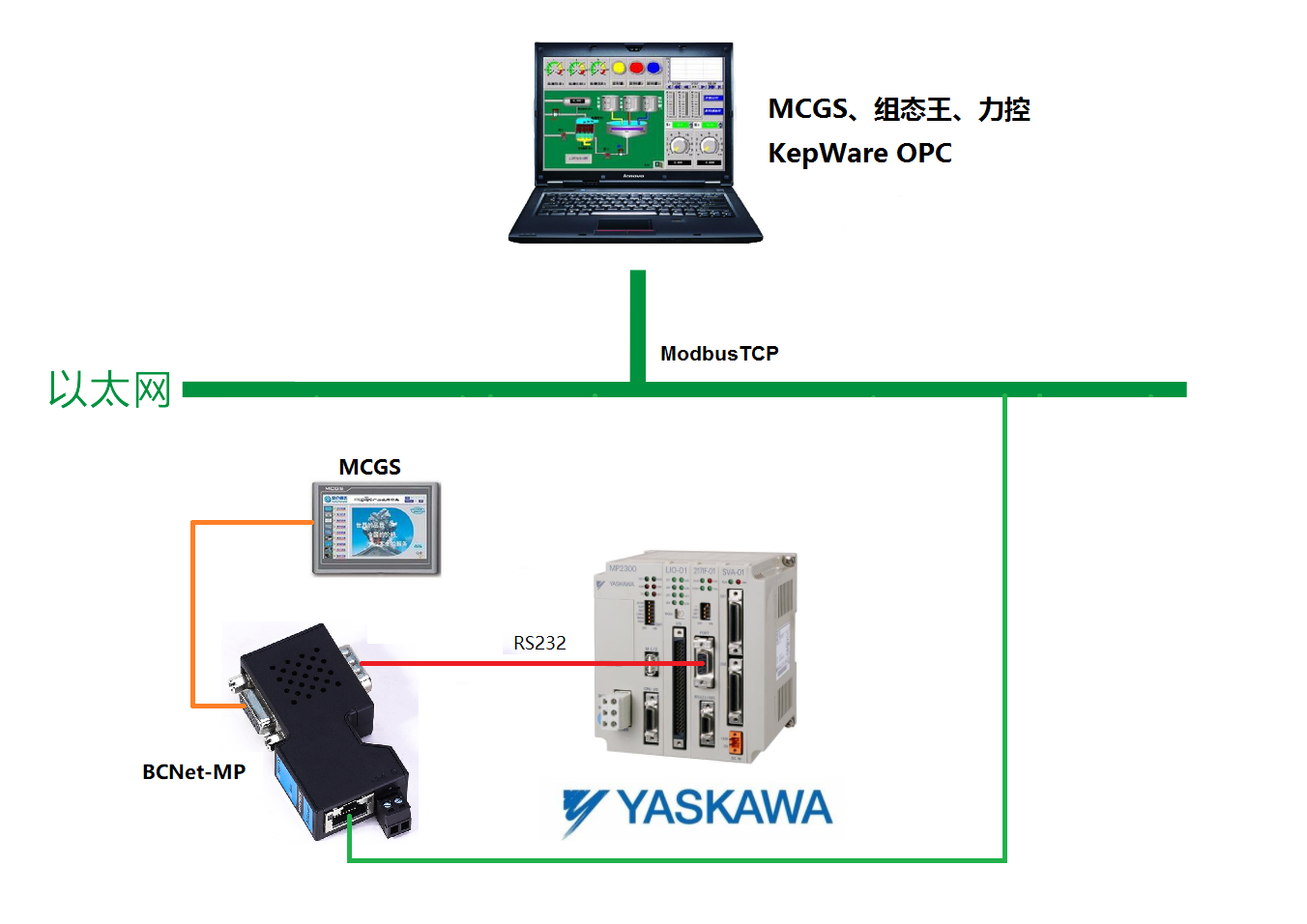 6、支持OPC通道的SCADA(上位組態(tài)軟件)以O(shè)PC方式與安川MP系列PLC通訊。