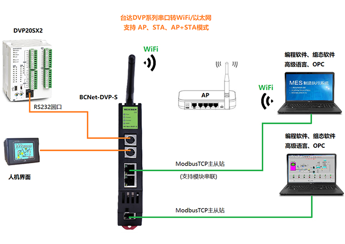 產(chǎn)品簡介 BCNet-DVP-S用于臺達(dá)DVP系列PLC的以太網(wǎng)數(shù)據(jù)采集,非常方便構(gòu)建生產(chǎn)管理系統(tǒng)。模塊集成WiFi功能,支持AP模式、STA模式和AP+STA模式,帶膠棒和磁吸天線,方便構(gòu)建WiFi網(wǎng)絡(luò),直接通過WiFi進(jìn)行PLC編程、數(shù)據(jù)采集。?BCNet-DVP-S采用即插即用設(shè)計(jì),不占用PLC通訊口,即編程軟件/上位機(jī)軟件通過以太網(wǎng)對PLC數(shù)據(jù)監(jiān)控的同時,觸摸屏可以通過復(fù)用接口與PLC進(jìn)行通訊,支持工控領(lǐng)域內(nèi)絕大多數(shù)SCADA軟件,支持臺達(dá)以太網(wǎng)協(xié)議和ModbusTCP通訊方式。