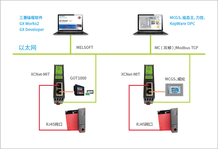 XCNet-MIT具備LAN1、LAN2兩個(gè)物理性接口,可將LAN1口所連接PLC的IP地址和端口號(hào),映射到LAN2口的任意IP和端口號(hào)。XCNet-MIT可將LAN1口的三菱MELSOFT協(xié)議自動(dòng)映射成LAN2口的ModbusTCP協(xié)議和MC(3E幀)服務(wù)器。
