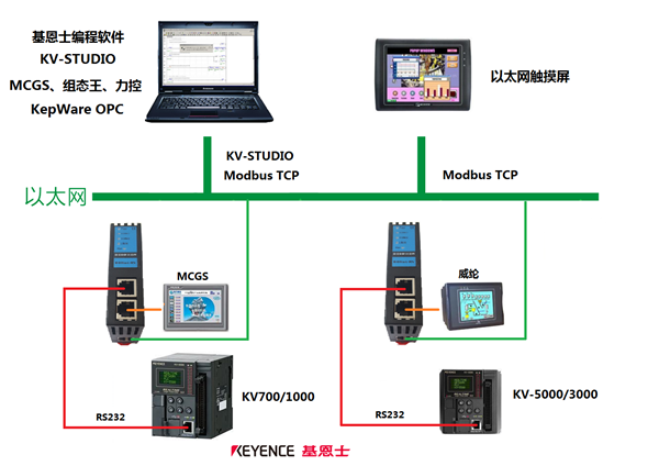 4、實現(xiàn)與基恩士KV STUDIO編程軟件產(chǎn)品的以太網(wǎng)通訊,通過以太網(wǎng)進行程序的讀出/寫入(包括RUN中寫入功能)/比對,可編程控制器運行監(jiān)視等功能。