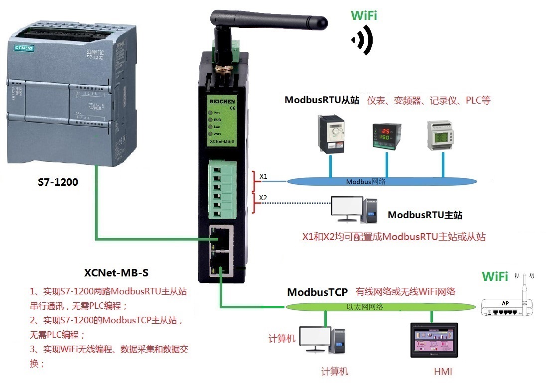 XCNet-MB-S是一款高性能協(xié)議轉(zhuǎn)換網(wǎng)關(guān),可實(shí)現(xiàn)西門子帶以太網(wǎng)接口的PLC(S7-1200/1500、S7-300PN、S7200 SMART等)、西門子以太網(wǎng)模塊(CP243-1、CP343-1等)的ModbusRTU串行通訊和ModbusTCP主從站通訊。模塊集成WiFi功能,支持AP模式、STA模式和AP+STA模式,帶膠棒和磁吸天線,方便構(gòu)建WiFi網(wǎng)絡(luò),可以通過(guò)WiFi進(jìn)行PLC編程、數(shù)據(jù)采集和數(shù)據(jù)交換。